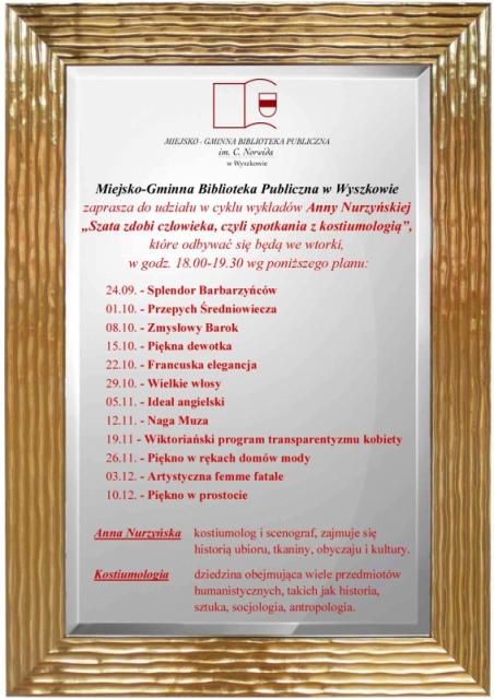Miejsko-Gminna Biblioteka Publiczna w Wyszkowie zapraszana cykl wykładów Anny Nurzyńskiej "Szata zdobi człowieka, czyli spotkania z kostiumologią".