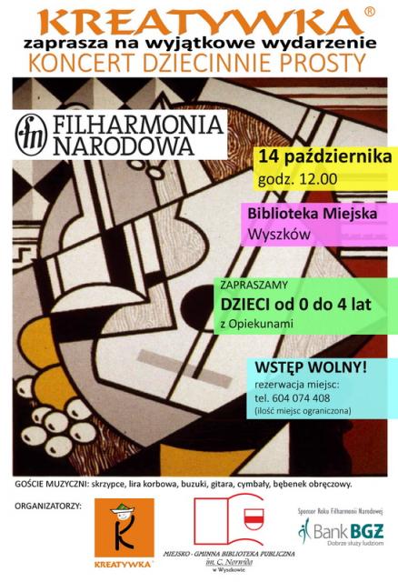 Kreatywka i Miejsko-Gminna Biblioteka Publiczna im. C. Norwida w Wyszkowie zapraszają dzieci na "Koncert Dziecinnie Prosty" w wykonaniu Filharmonii Narodowej.