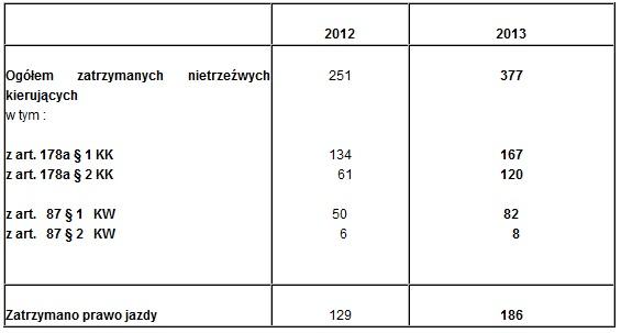 Poniżej przedstawiamy dane statystyczne z Wydziału Ruchu Drogowego KPP w Wyszkowie, przedstawiające ilości zatrzymanych nietrzeźwych kierujących w okresie od 1 stycznia do 30 września 2013 roku w porównaniu z tym samym okresem czasu roku ubiegłego.